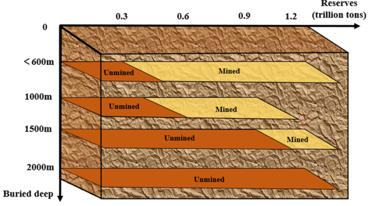Most of China’s coal production is from underground mines with mining cost increasing with depth. It is said that the average depth of Chinese underground coal mines is increasing by 10 to 25 metres per annum. The average dip of coal seams mined is 13˚. There is indirect support for the view that at least half of China’s coal endowment has been mined from this graphic from a 2023 paper: