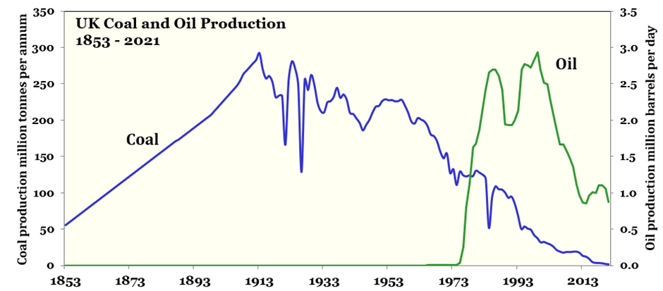 Figure 4: UK Coal and Oil Production 1853 – 2021