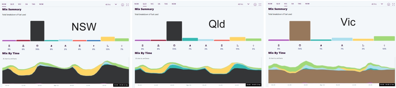 Just for interest, I compiled graphs of the last 48 hours of electricity supply for the 3 main states in the Australian East Coast NEM.