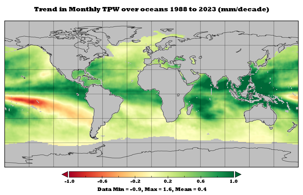 The amount of precipitable water in the atmosphere is increasing. It is increasing more in the NH than the SH but, on average, the SH is also increasing. TPW over the Pacific off California has not increased much at all – per attached