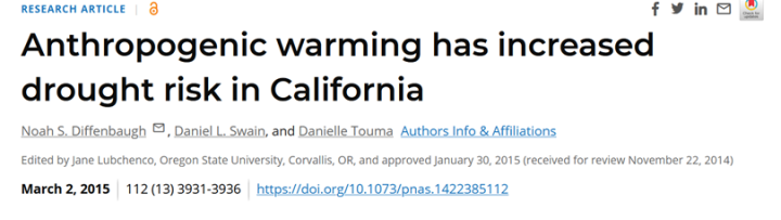 We therefore conclude that anthropogenic warming is increasing the probability of co-occurring warm–dry conditions like those that have created the acute human and ecosystem impacts associated with the “exceptional” 2012–2014 drought in California.