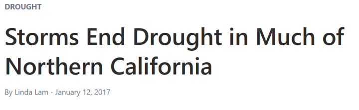 I grew up in California. Since the mid 1970’s the phrase “but the drought’s not over” became so repetitive in state government and media communications that it was a running joke for more than four decades between my brother and I, until he finally passed away. This drumbeat began long before “Climate Change” or “Global Warming” became widespread issues of concern. The corollary to “but the drought’s not over” was the proclamation by government and media every single late spring or early summer that: