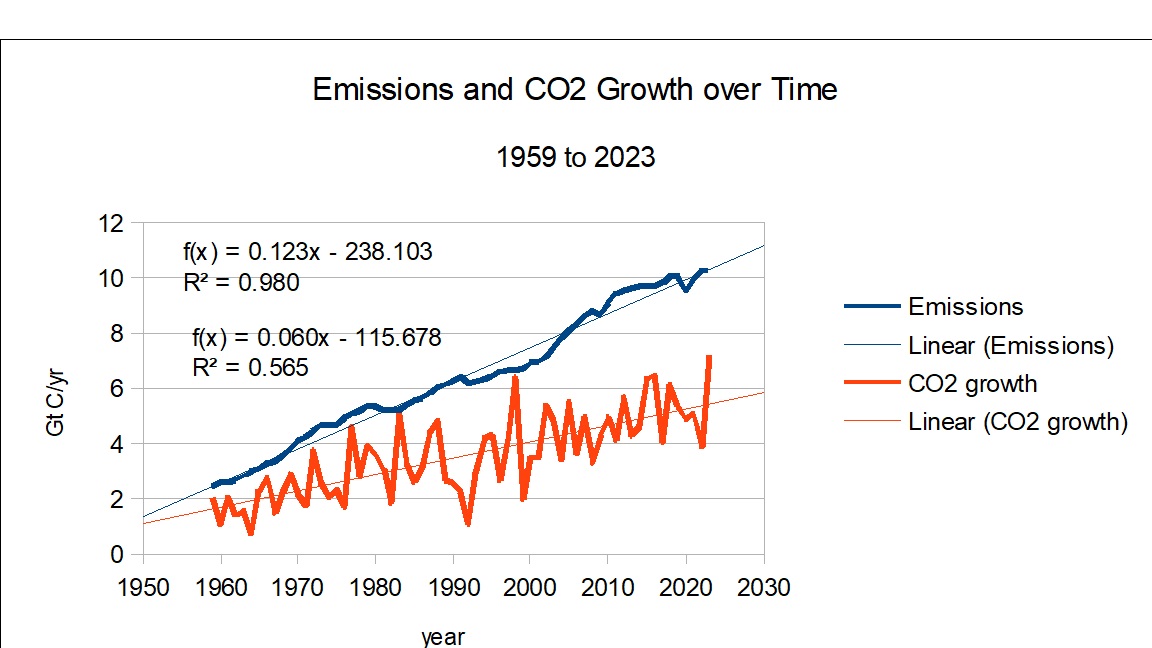 Here is the up to date graph including 2023. (using Mauna Loa growth data)