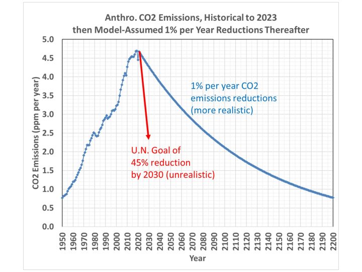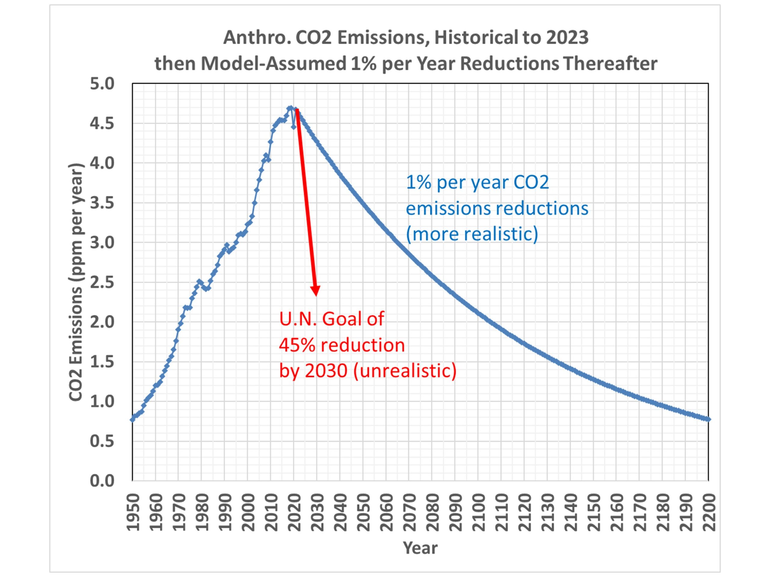 But let’s look at what a much more modest reduction in CO2 emissions (1% per year) would do to future atmospheric CO2 concentrations. Here’s a plot of the history of global CO2 emissions, and how that trajectory would change with 1% per year reductions from 2023 onward. (Even this seems optimistic, but we can all agree the U.N.’s goal is delusional),