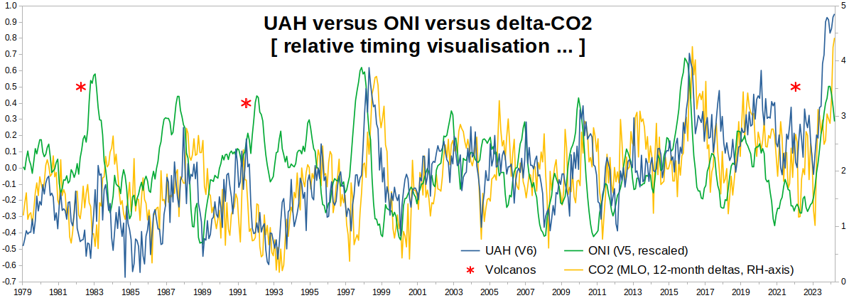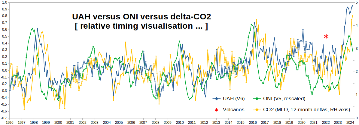 Doing this for the ONI (my usual ENSO / SOI proxy) and UAH compared to the year-on-year deltas for the Mauna Loa atmospheric CO2 concentrations gave me the graph attached below.