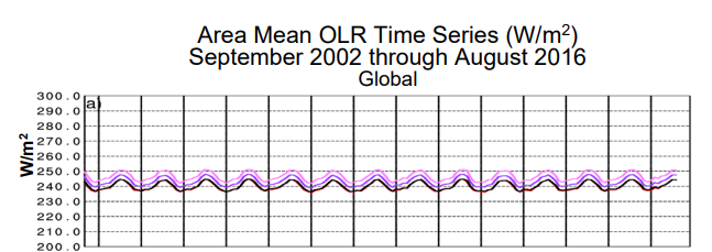 Except it directly does. Doubling CO2 is supposed to add 4W/sq meter. We’ve seen an increase in OLR, not a decrease. So either we’re already coming to equilibrium through cooling (which is absurd given the time requiring a planet like Earth with oceans to come to “equilibrium,” or CO2 doesn’t do what you think it does.