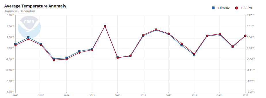 NOAA’s USCRN reflects faster global warming than nClimDiv, (+0.34 degrees C. for USCRN versus +0.27 degrees C. for nClimDiv, both from 2005 through 2023). NClimDiv was the official US average used for the GAT since 2014.