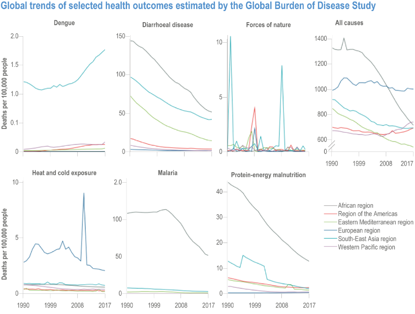 As the data clearly show, since 1990 there have been radical reductions in mortality caused by malaria, malnutrition, diarrhoeal disease, natural disasters and exposure to temperature extremes. The only departure from those trends is dengue, which in any case is of far less significance than the other factors, claiming approximately just 1.75 lives per 100,000 per year, compared with malaria, which claims more than 50.