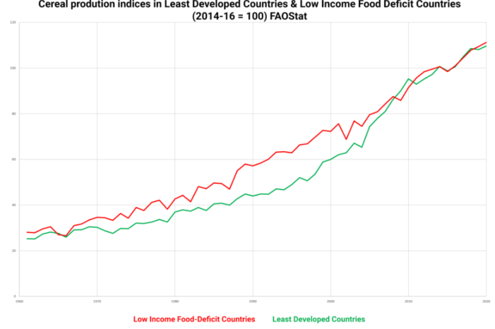A similar ‘paradox’ can be shown by comparing the WHO’s statements on food security with other UN agencies’ data. There is no evidence of climate change adversely affecting agricultural production in vulnerable economies.