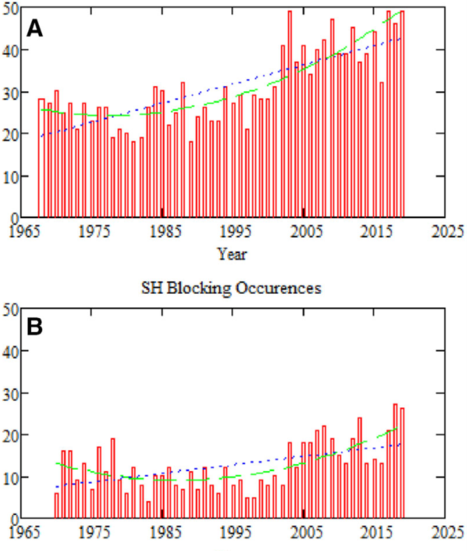 Developments on GIS are connected to the polar vortex, and weather blocking patterns, that both have multi-decadal variations. Currently, the PV is in a weakening trend, and consequently atmospheric blockings are in an upwards trend, but this will change.
