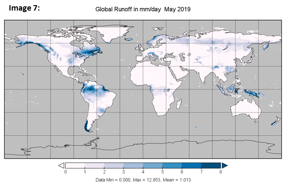 The water transfer from ocean to land can be assessed by monitoring the runoff of water from land being returned to the ocean. The Global Runoff Data Centre (GRDC) has been compiling runoff data for over a century and has global coverage at very high resolution. Image 7 provides a snapshot of the data for May 2019. May is the month of highest runoff typically averaging 1mm/day for the entire land mass totalling 1.47E14m^2 where runoff occurs. The data does not include glacier calving or ice shelf loss.
