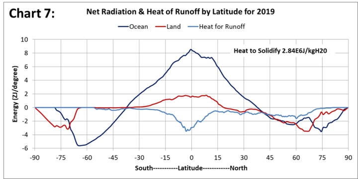 Chart 7 plots the Net heat absorbed for land and ocean as well as the calculated heat release from atmospheric water condensing to produce runoff; all for 2019.