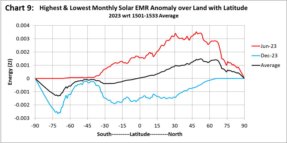 From a spatial perspective, the range in solar EMR over land is increasing in the NH but reducing in the SH. Chart 9 displays the anomaly for highest and lowest month as well as the average over all land surface by latitude.