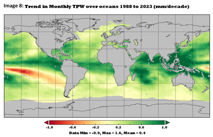The mean increase of 0.4mm/decade is significant because the average level in 1988 was 27mm. So over the 35 years of the record, the average has increased by 5%. The increase is more significant in the NH and there is already large regions in the SH with no trend or negative trend.