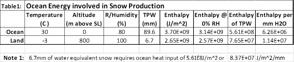 Snow falling on land is an energy intensive process. The energy requirement is far greater than just the latent heat of water vaporisation. Table 1 provides the energy inherent in two atmospheric columns at conditions related to ocean warm pools and conditions conducive to forming snow over land.