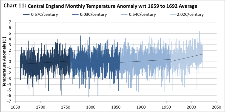 Historical records reveal that climate change is not something that started last century. The central England temperature (CET) record is the longest continuous instrumented temperature record available. Chart 11 provides the anomalous record relative to the first 33 years of the record with three 100 year trends and the last 70 years. Each 100 year interval has a positive trend, albeit the second 100 years just positive, with last 70 years higher than any of the 100 year trends; indicating acceleration similar to the average of the highest and lowest accumulated solar EMR over land in Chart 8 above..
