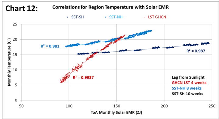 Earth’s climate system has thermal inertia. Measured and visible changes lag the changing solar EMR. Surface temperature over land has a phase shift of 4 weeks relative to the ToA solar EMR. The NH oceans lag by 8 weeks and the SH oceans lag by 10 weeks. Once the phase shifts are made, the thermal responses of the respective surfaces are highly correlated to the available ToA solar EMR over the particular surface as shown in Chart 12 for period 1982 to 2022.