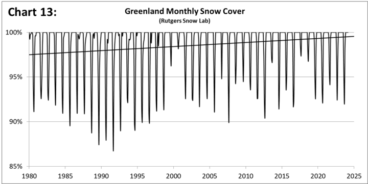 Greenland has retained most of its ice during the Holocene and it is now advancing again as displayed in Chart 13 based on Rutgers Snow Lab measurements. The trend is toward 100% permanent cover before 2100.