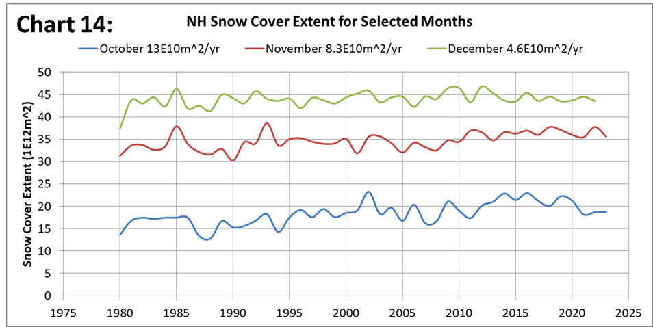 The current increasing trend in NH peak solar intensity commenced around 500 years ago. The Viking colonisation of Greenland failed around the time of lowest summer solstice sunshine in the NH. Since the lowest peak intensity, the temperature of the NH has been trending upward with some cumulative thermal response being observed such as permanent ice loss and increased biomass as well as a corresponding increase in atmospheric water. There is now a clear upward trend in early season snowfall per Chart 14 and a lesser upward trend in maximum extent normally set in December. The permanent snow cover extent over NH land is still declining with most permafrost measurements showing permafrost still melting.