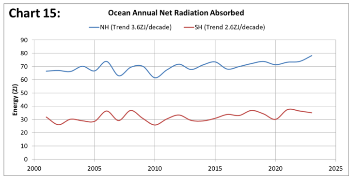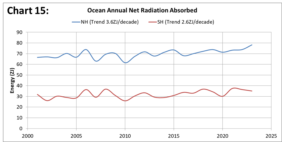 In the last two decades the Net radiation absorbed by the NH oceans and atmosphere has shown a strong upward trend per Chart 15.