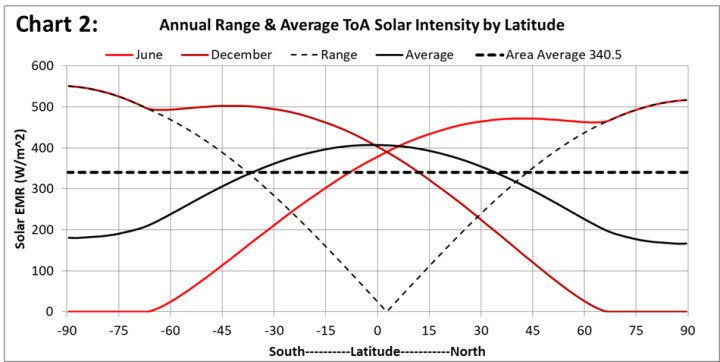 It is possible to calculate the ToA solar intensity anywhere over the globe using orbital ephemerides, planetary geometry and a selected value for the solar constant, which is not quite constant but changes less than 0.2% whereas the annual variation in ToA intensity is almost 7% range of the average. Chart 2 is based on a solar constant of 1362W/m^2 for the 2022 orbit.