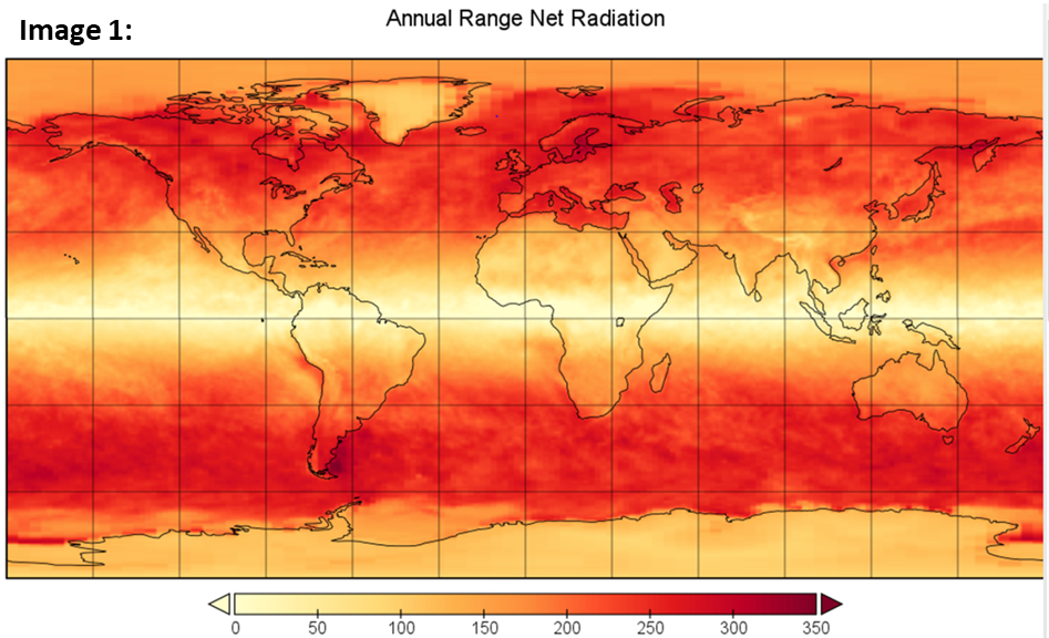 The Cloud and Earth’s Radiant Energy System (CERES) project has been producing high resolution global ToA radiation data since 2001 using satellite based instruments. The monthly average Net radiation ranges from typically minus 208W/m^2 up to 190W/m^2. Image 1 provides a spatial perspective of the annual range for Net radiation in W/m^2 between the maximum and minimum for both hemispheres.