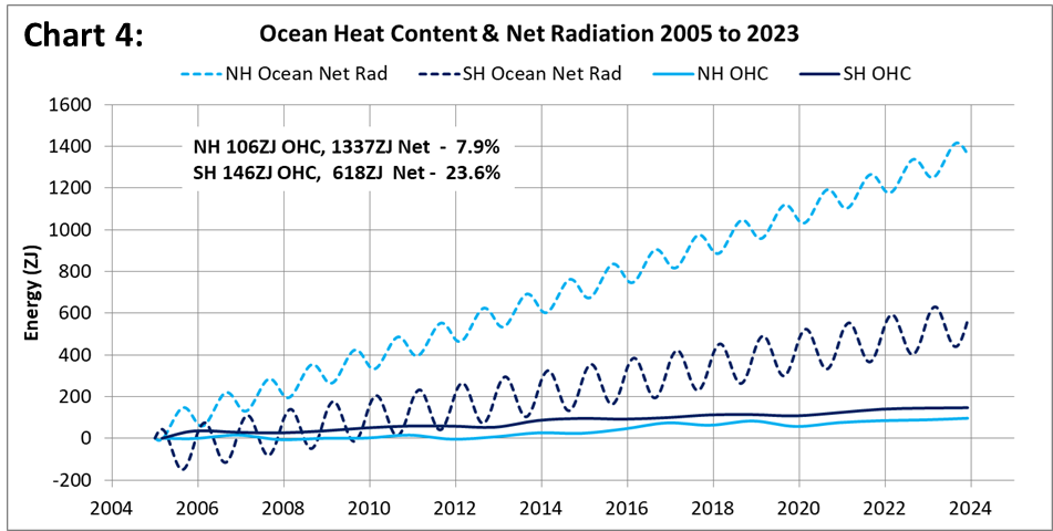 Chart 3 compares the accumulated Net radiation and OHC by latitude for oceans in the Northern Hemisphere and Southern Hemisphere for the concurrent interval with the Argo measurements from December 2005 to December 2023.