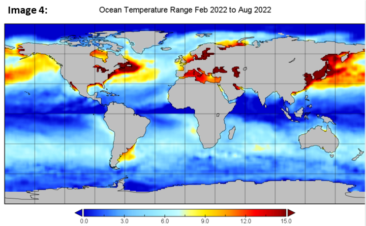 Ocean surfaces respond slower and over a smaller range than land; exhibiting widest range from February to August, thus lagging the peak range in solar EMR by two months. Image 4 displays the spatial temperature range for the oceans using Reynolds OI sea surface temperature (SST).