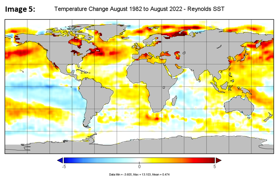 The satellite era improved the global coverage of surface temperature measurement particularly for the oceans. The Reynolds (SST) combines satellite measurements over the oceans with surface measurements to produce accurate, high spatial resolution data. Image 5 depicts the change in SST from August 1982 to August 2022. Global SST has exhibited the largest monthly increase in August so Image 5 shows where the oceans are warming the most.