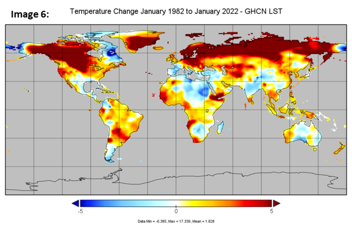 Global land has experienced the greatest monthly increase in January. Image 6 displays how the LST has changed from January 1982 to January 2022 based on the GHCN LST data, which excludes Antarctica.