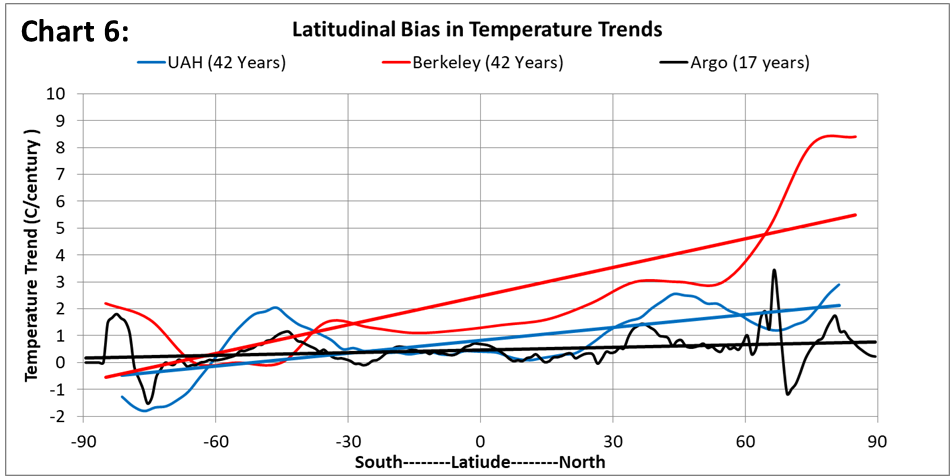 Chart 6 examines the monthly temperature anomaly trends relative to latitude for surface measurements based on the Berkeley LST; the lower troposphere using UAH TLT and the Argo deep ocean temperature.