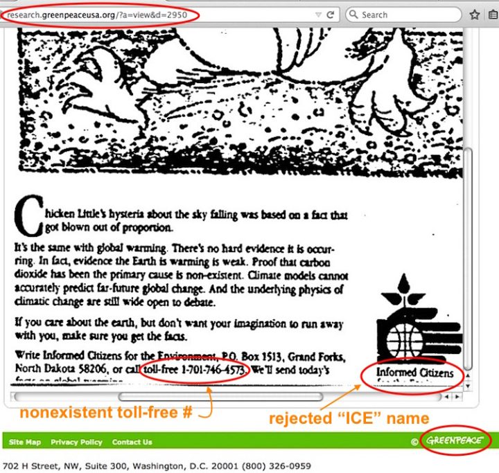 The “Greenpeace USA née Ozone Action” memo scans collection that included this advertorial went offline in April 2022, but I downloaded that collection before then and saved them here. The Google Image results for the “Chicken Little” ad always show the bottom cropped in some way. What happens when anyone magnifies that advertorial in the Greenpeace/Ozone Action scans? It shows a non-existent “toll-free” number, and a name suggestion for the PR campaign that was unsolicited and never used.
