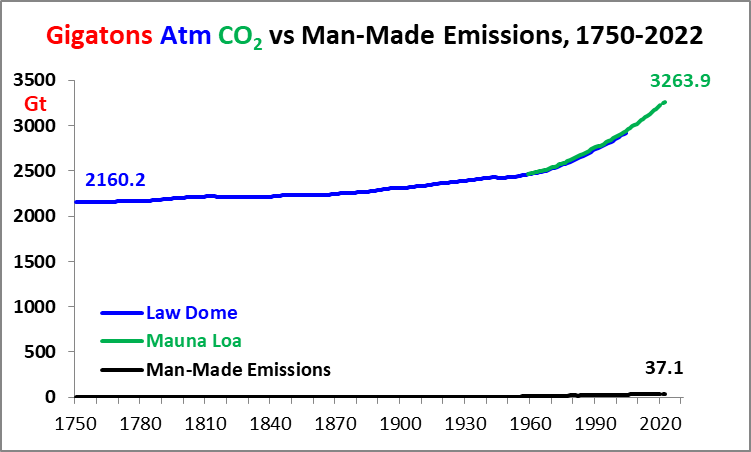 The reality is 2022 MME only managed to equal 1.1% of the 2022 Mauna Loa CO2, ie 37.1 Gt divided by 3263.9 Gt (418.2ppm * 7.80432 Gt/ppm), properly shown below on the same scale: