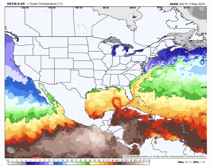 Perhaps, this blog spends too much time talking about the atmosphere, so to make amends today, let’s see what is happening to the temperature of the ocean surface. And see whether anything unusual is going on. Let’s start with yesterday’s sea surface temperatures around North America (below). Sorry, it is all in °C. Keep in mind that 10°C is roughly 50F, 20°C is around 68F, and 30°C is approximately 86F.