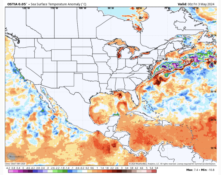 The East Coast is a study in contrasts. The water off of New England is crazy cold (dropping below 7C), while the uber-warm Gulf Stream is found along the west coast of Florida, moves past the Carolinas, and then heads northeastward into the Atlantic.