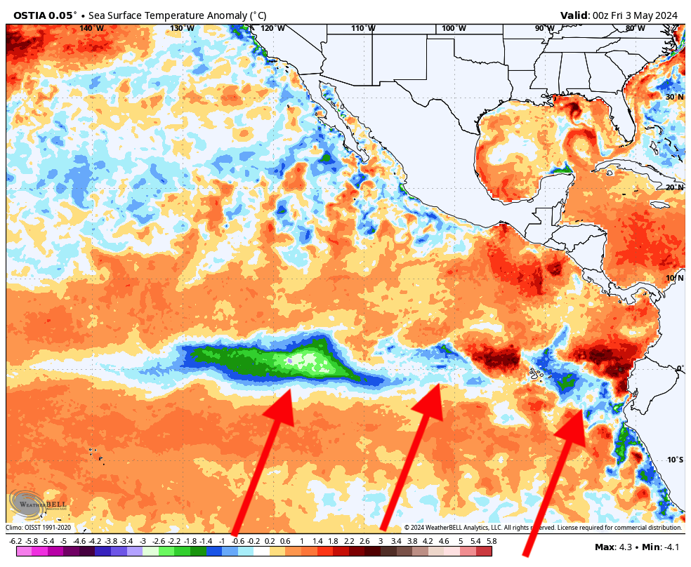 But something major has happened. The tropical Pacific surface waters are rapidly cooling, resulting in cooler than normal waters in many locations (see map, with arrows showing you some of the coolest spots).