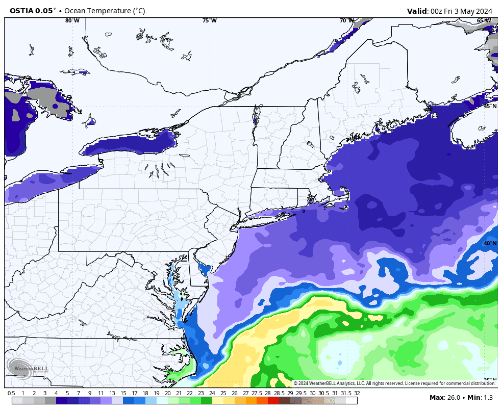 “The water off of New England is crazy cold (dropping below 7C)…”.
