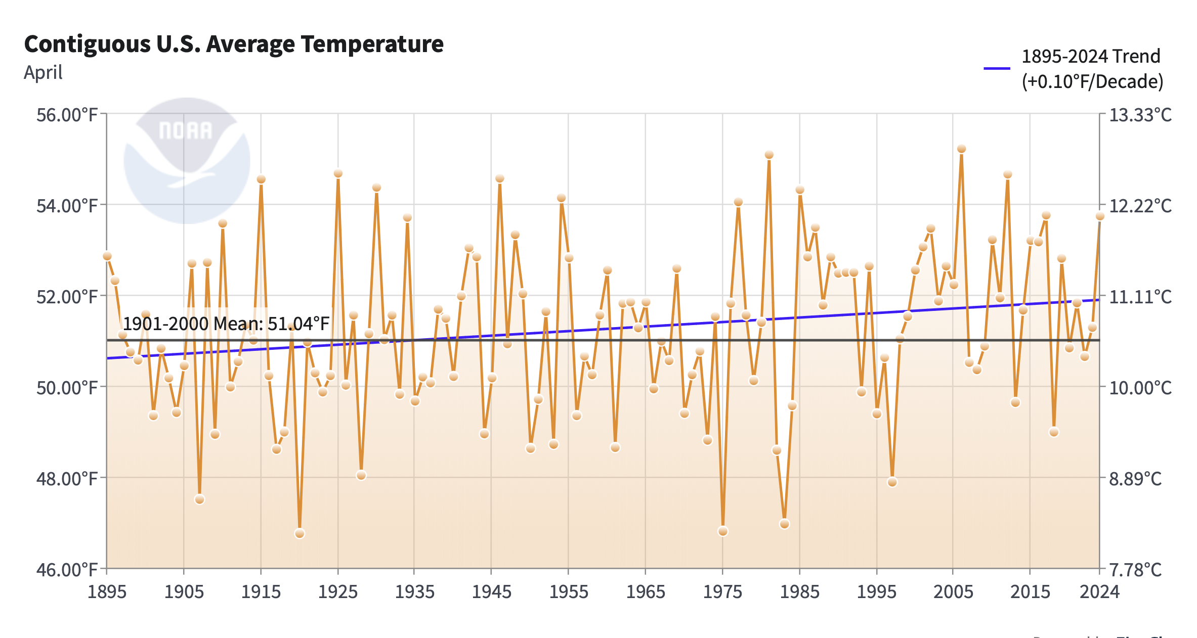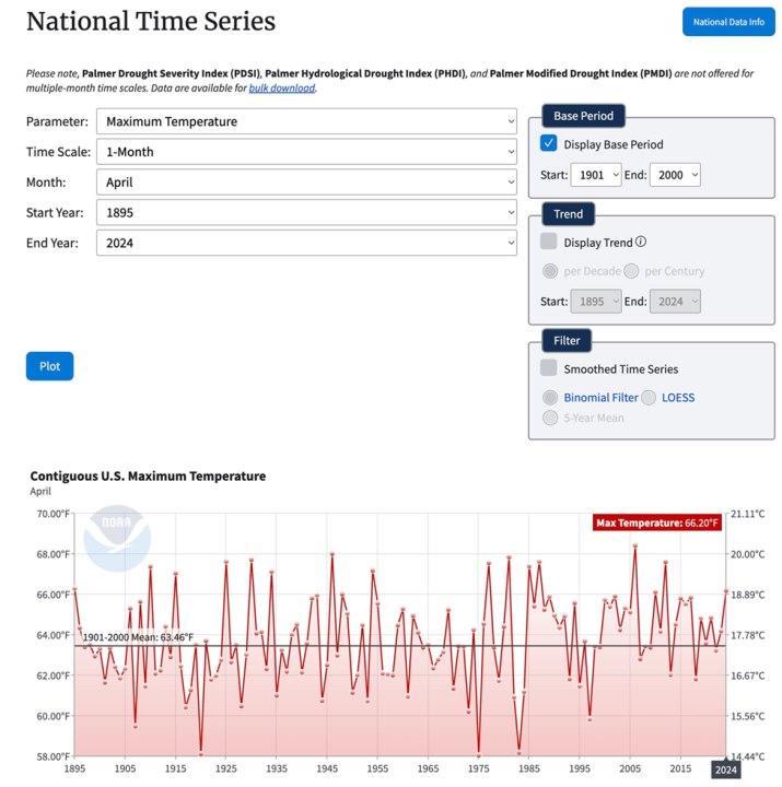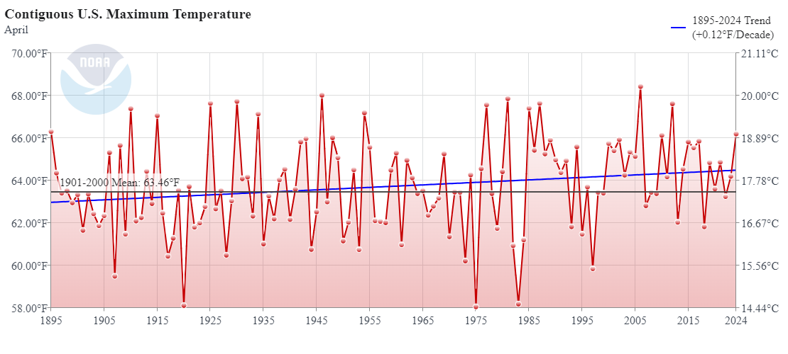 NOAA’s Contiguous U.S. maximum April temperatures between 1895 and 2024 clearly refutes climate alarmists exaggerated and politically driven claims that we are experiencing a “climate emergency”.