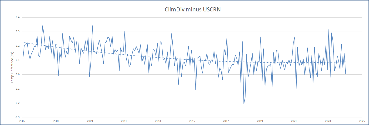 That is very suspicious, and another reason to distrust NOAA. If you distrust NOAA, as I do, then you have no idea if either USCRN or nCllimDiv are accurate.