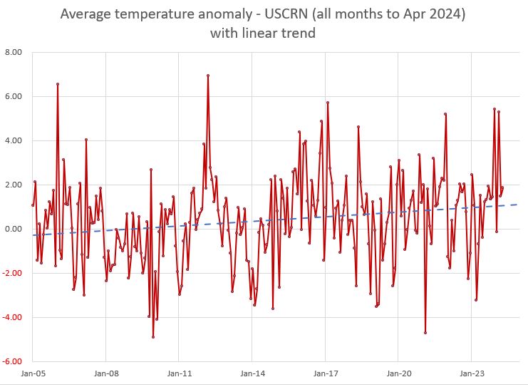 USCRN had reflected a +0.34 degree C. per decade warming rate since 2005. The April data will only make that number increase