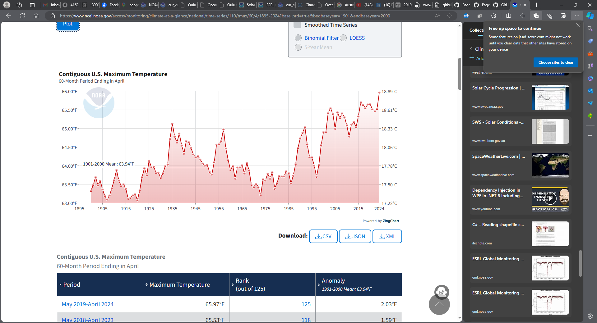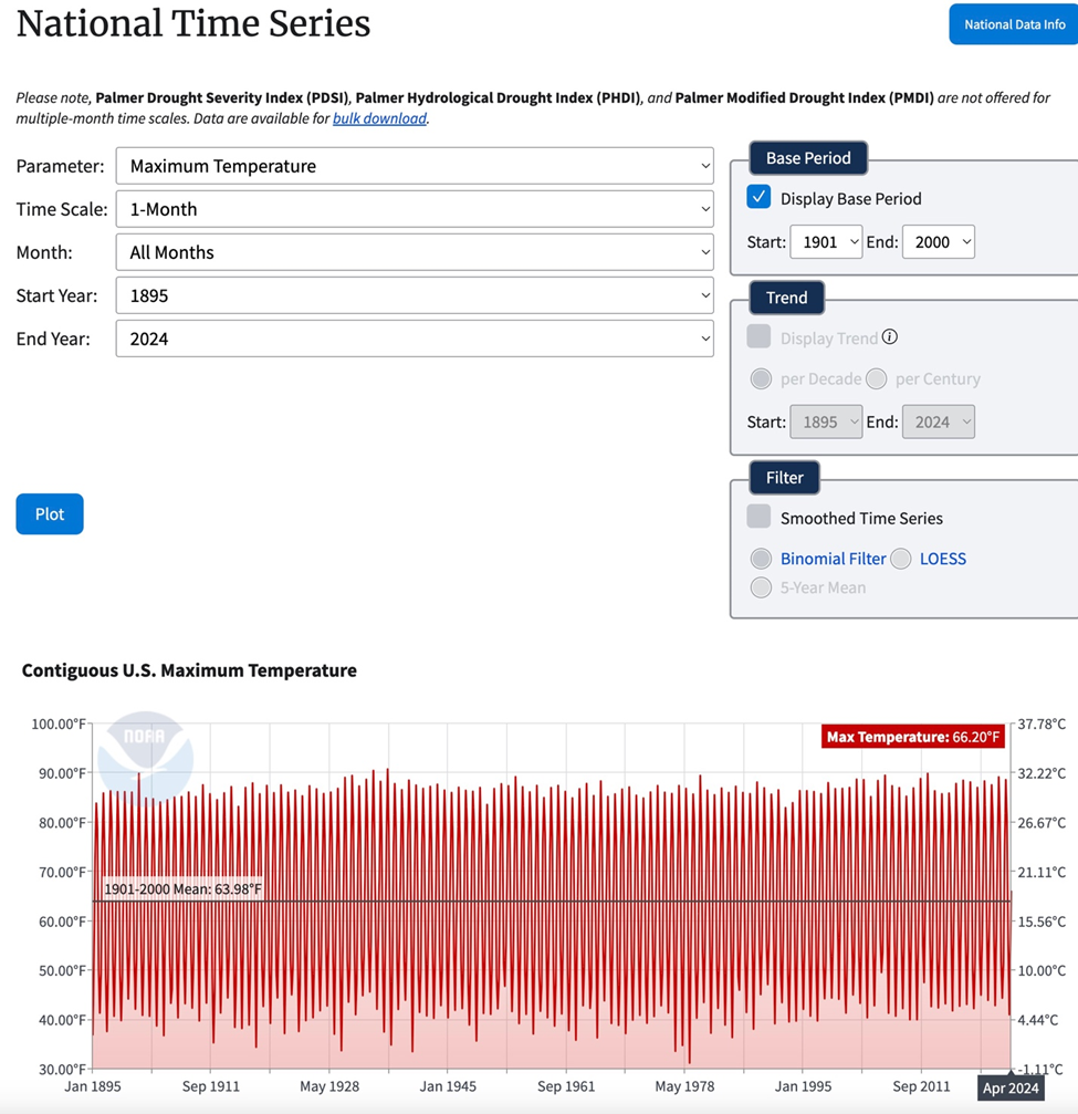 NOAA has updated its Contiguous U.S. National Temperature Index Temperature Anomaly data and its National, Statewide, County and City Time Series temperature data (as well as other climate data parameters) through the April 2024 period.