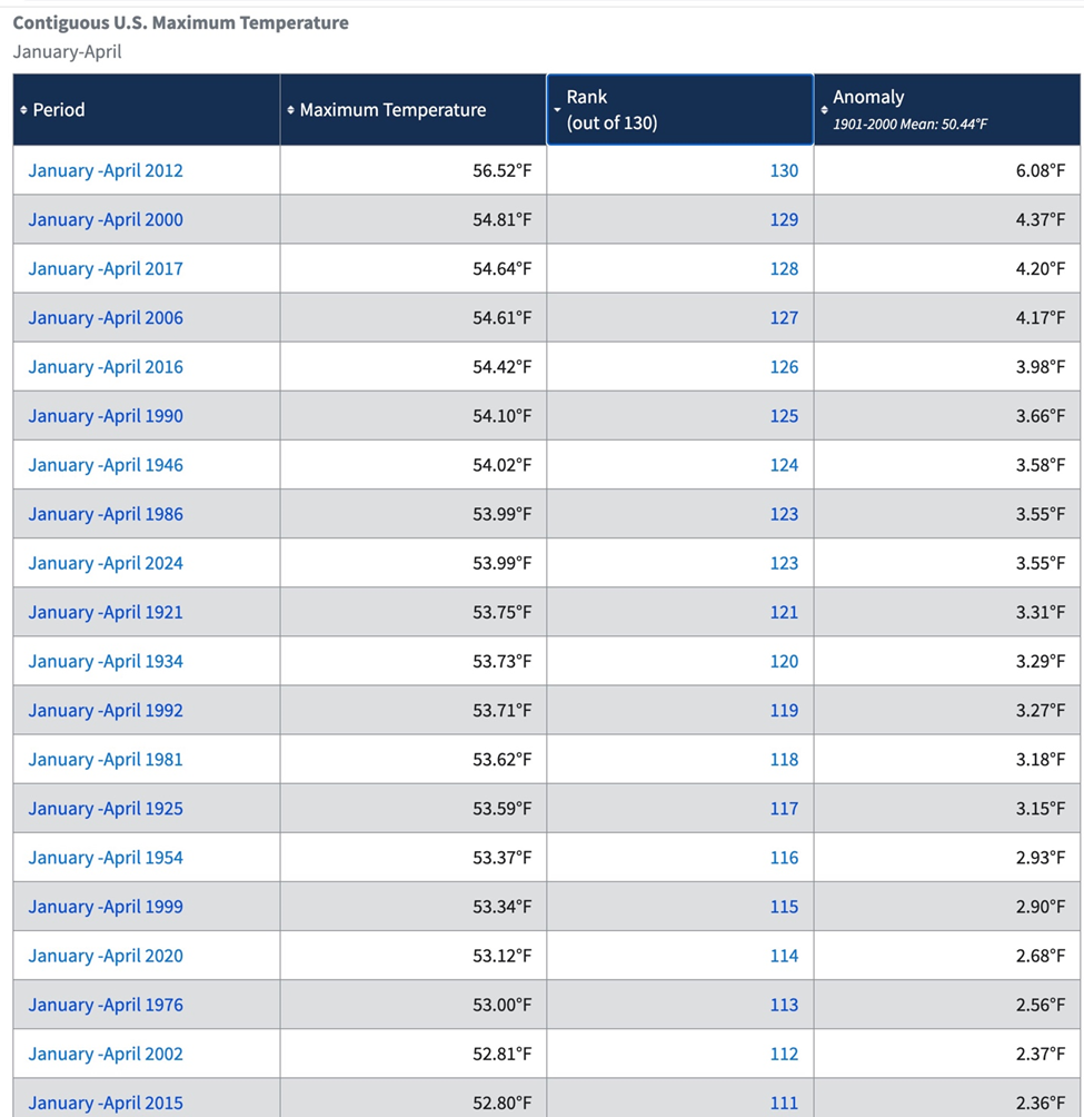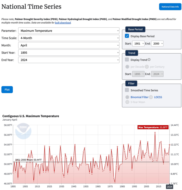 NOAA’s Contiguous U.S. maximum January through April temperatures between 1895 and 2024 clearly refutes climate alarmists exaggerated and politically driven claims that we are experiencing a “climate emergency”.