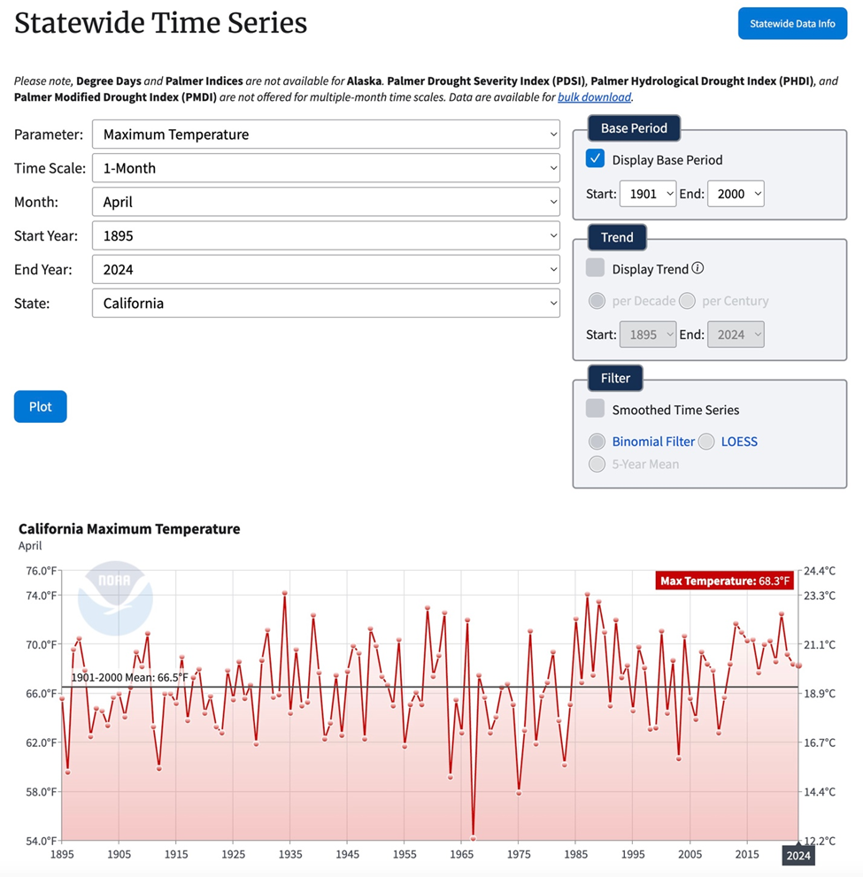 NOAA’s California Statewide Time Series maximum temperature data for April months between 1895 and 2024 refutes climate alarmists exaggerated and politically driven claims that we are experiencing a “climate emergency”.