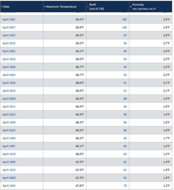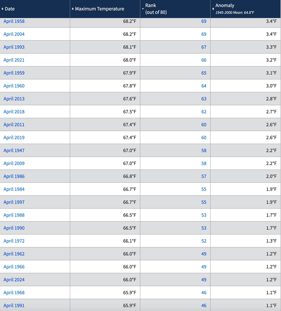 April 2024 is only the 86th highest April maximum temperature out of 130 highest April measured temperatures since April 1895 as shown below.