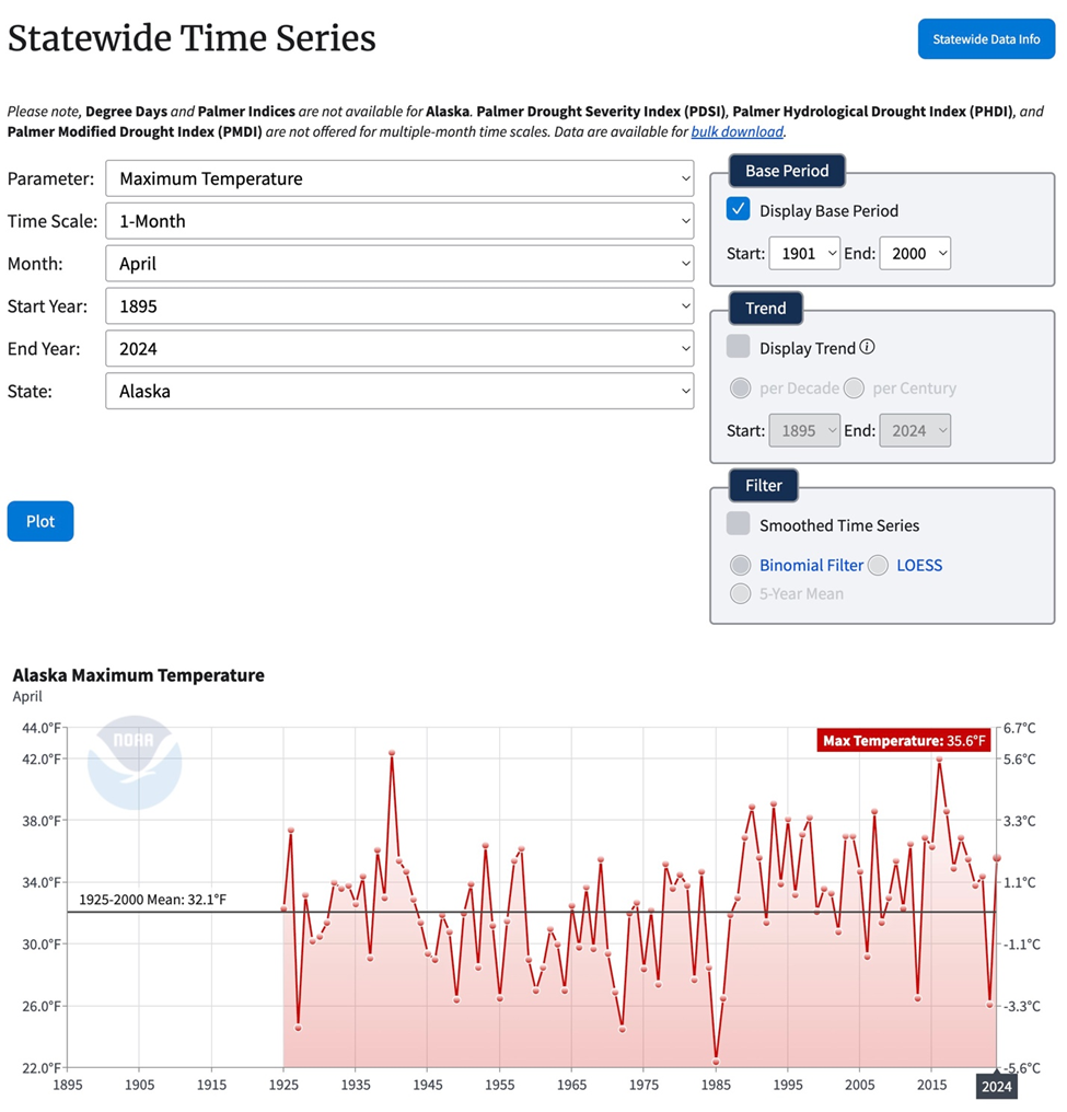 This same outcome is also true for Alaska as shown below where the April 2024 result was only the 80th highest maximum temperature out of 100 highest April months.