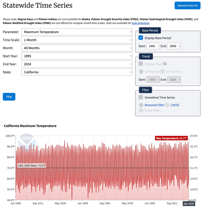 NOAA’s California Statewide Time Series maximum temperature data for all months between 1895 and 2024 refutes climate alarmists exaggerated and politically driven claims that we are experiencing a “climate emergency”.