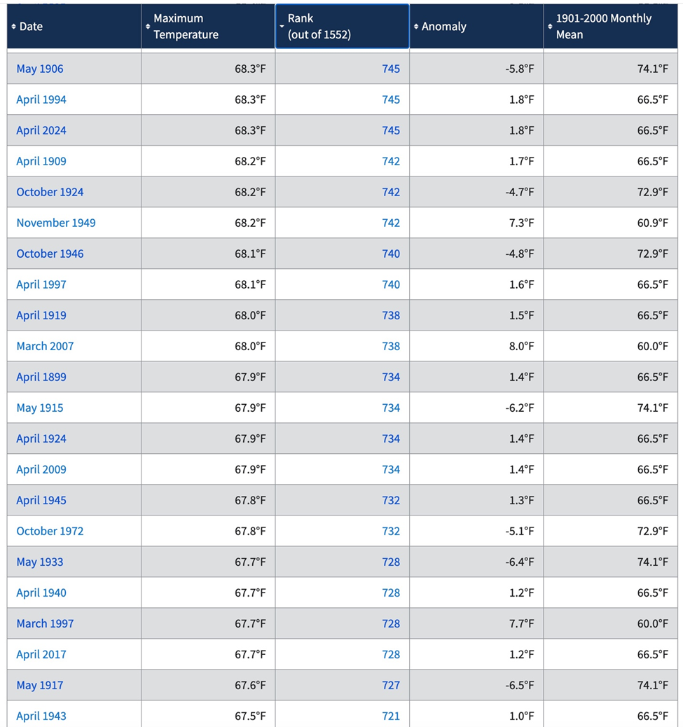 April 2024 is only the 808th highest month out of 1552 highest months measured since 1895 as shown below.