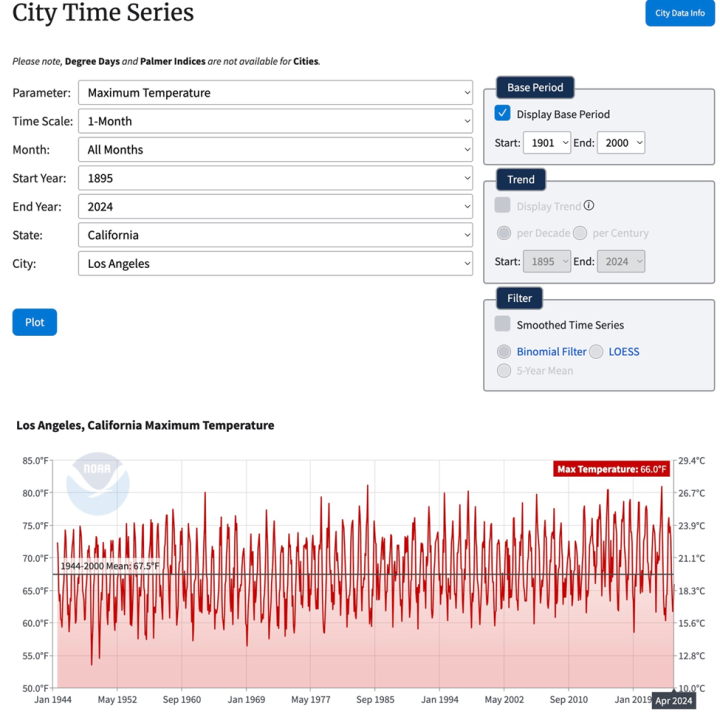 NOAA’s City Time Series for Los Angeles, California maximum temperature data for all months between August 1944 and April 2024 refutes climate alarmists exaggerated and politically driven claims that we are experiencing a “climate emergency”.