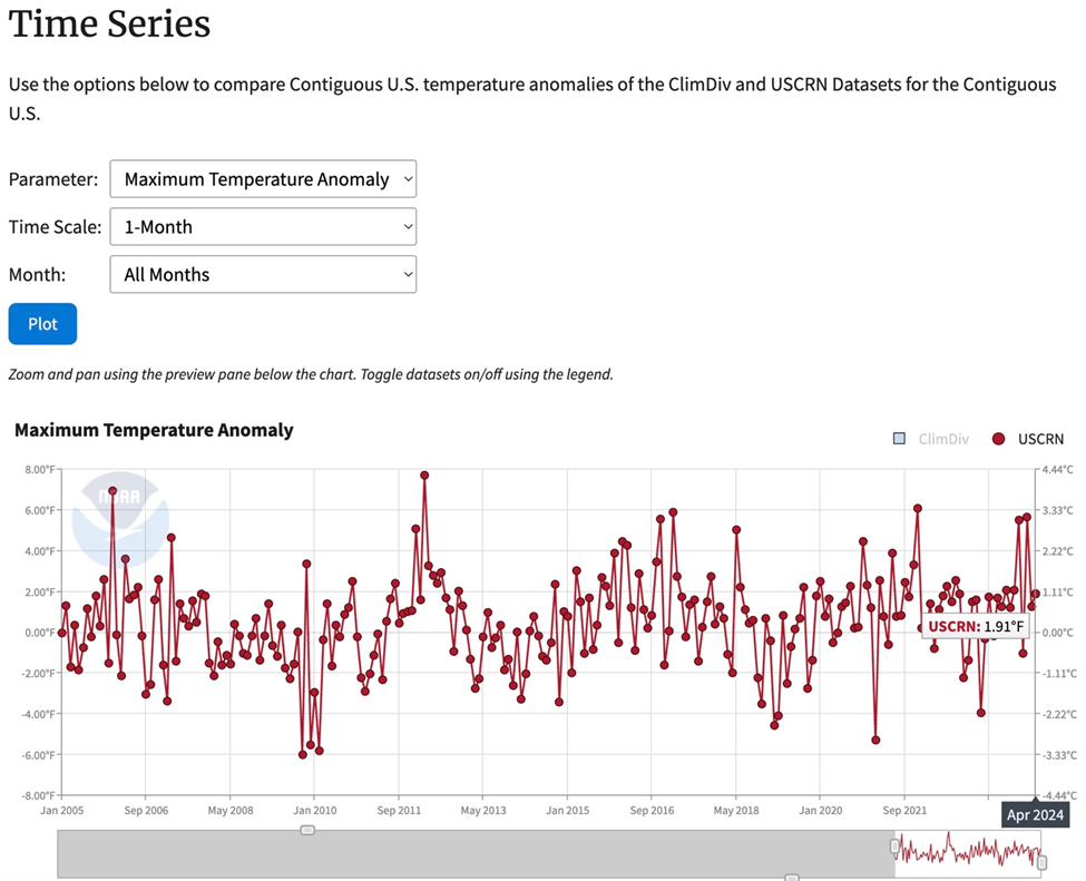 NOAA’s National Time Series USCRN maximum temperature anomaly dataset for the Contiguous U.S. is shown below with the data updated through April 2024.