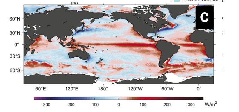 Panel “C” from Cronin (2024) illustrates the heat flux into the ocean during the instrumental period. The greatest heat flux into the ocean (red regions) happens in the eastern Pacific, exactly where La Nina-like conditions reduce cloud cover. That solar heat is stored in the subsurface and transported via ocean currents poleward. The blue regions represent areas where more heat ventilates out of the ocean than enters. Thus those regions do not warm the oceans, but cool the oceans. There is no global ocean warming. Ocean warming is local!